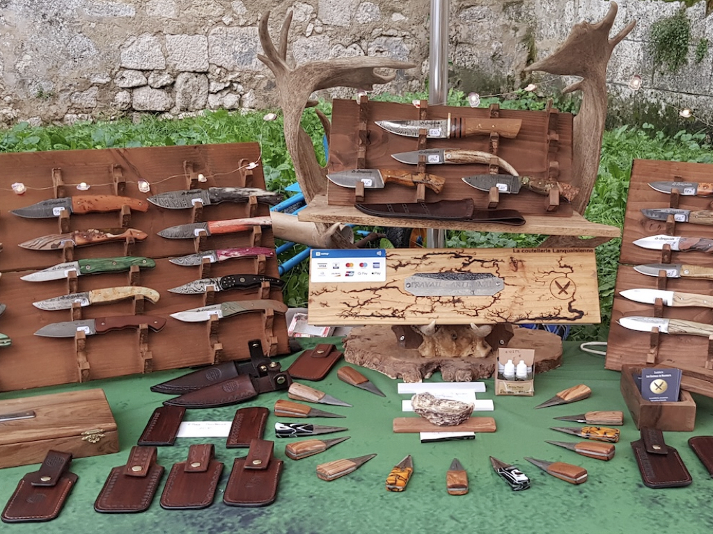 Les couteaux d’exception sont travaillés dans des matériaux rares et précieux : manches en bois fossile, en os de girafe, en ivoire de mammouth, ou encore incrustations de matières atypiques. Ces réalisations uniques dépassent l’usage quotidien pour devenir de véritables pièces de collection, parfois offertes lors d’occasions marquantes. Chaque couteau est un témoignage du mariage entre tradition coutelière et créativité.